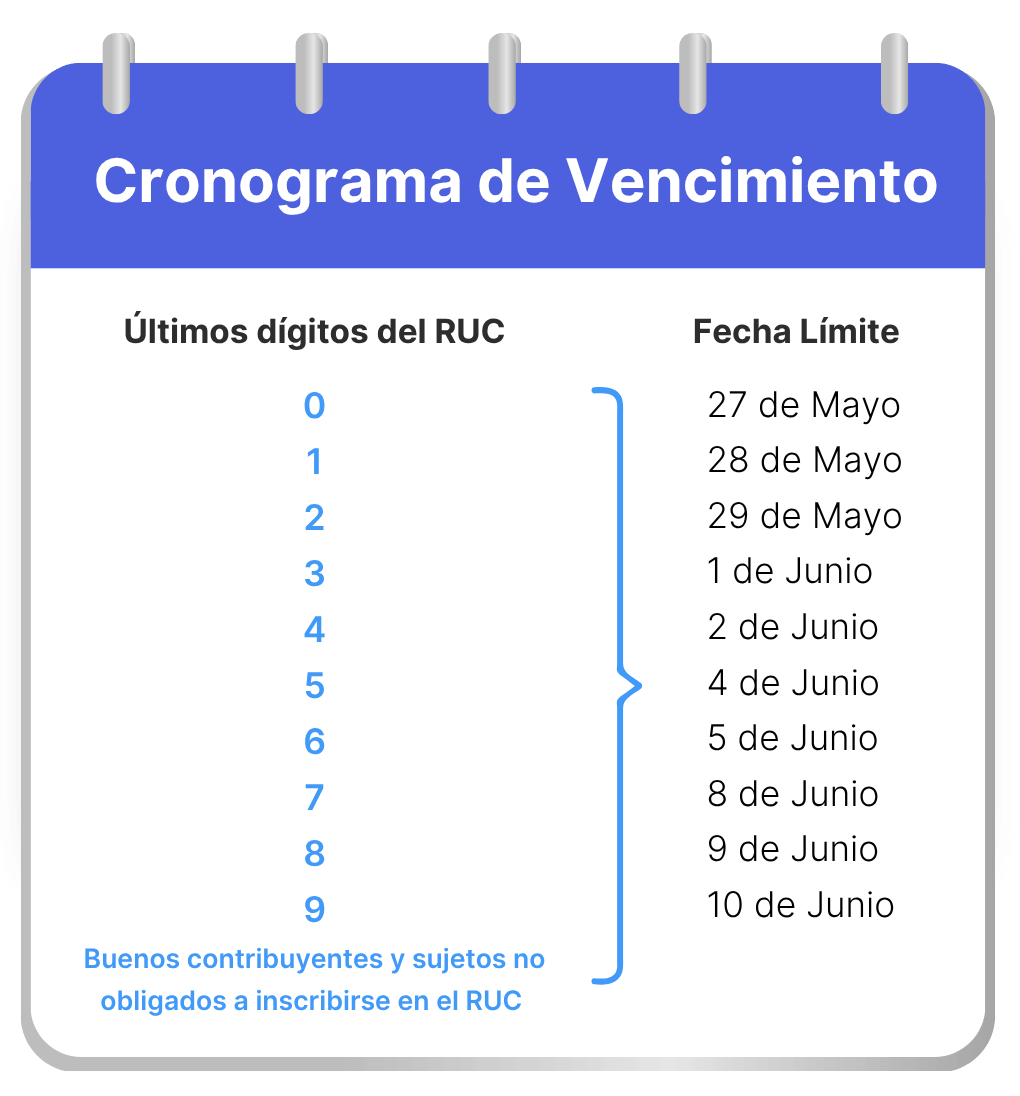 El cronograma de la Declaración Jurada Anual 2026 para personas naturales inicia el 27 de mayo y finaliza el 10 de junio de 2026. La fecha exacta límite dependerá del último dígito de tu RUC. Te recomendamos tener tus comprobantes y certificados de retención listos antes de tu fecha de vencimiento para evitar moras o multas por parte de la SUNAT.